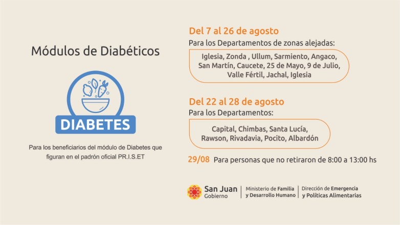 La Dirección de Emergencia y Políticas Alimentarias, dependiente del Ministerio de Familia y Desarrollo Humano, informa que a partir del jueves 7 de agosto, inicia una nueva etapa de distribución de módulos alimentarios destinados a personas con diabetes en todo el territorio provincial.